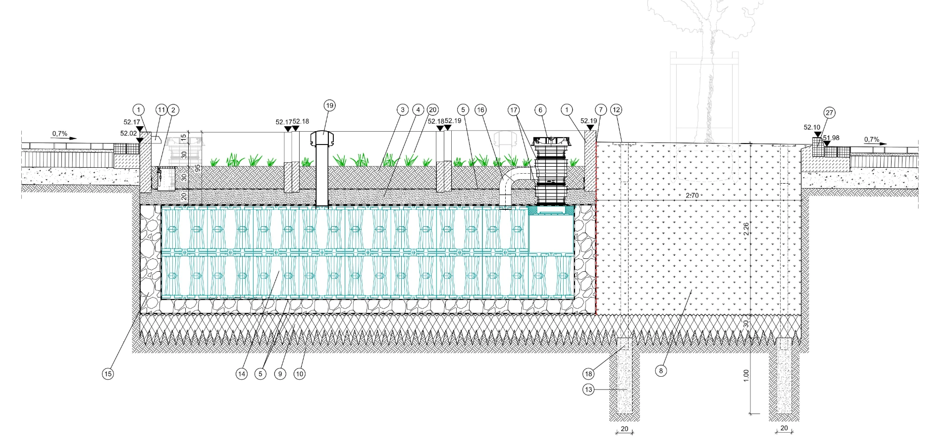 Für jedes Baufeld oder Grundstück wurde ein Überflutungsnachweis erstellt. Das Entwässerungskonzept wurde von IPL CONSULT gemäß DIN EN 1986-100 für jedes Baufeld für jedes Grundstück entwickelt. Auch auf den privaten Grundstücken wurde eine konsequente Regenwasserversickerung gemäß DWA-A 138-1/-2 und DWA-A 102 umgesetzt.