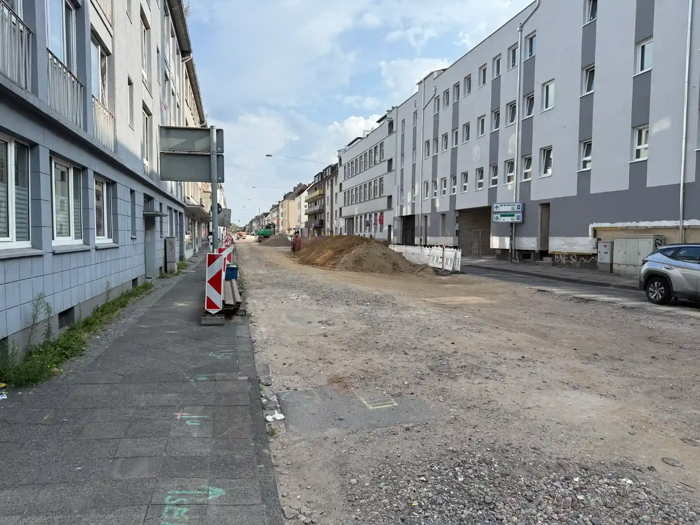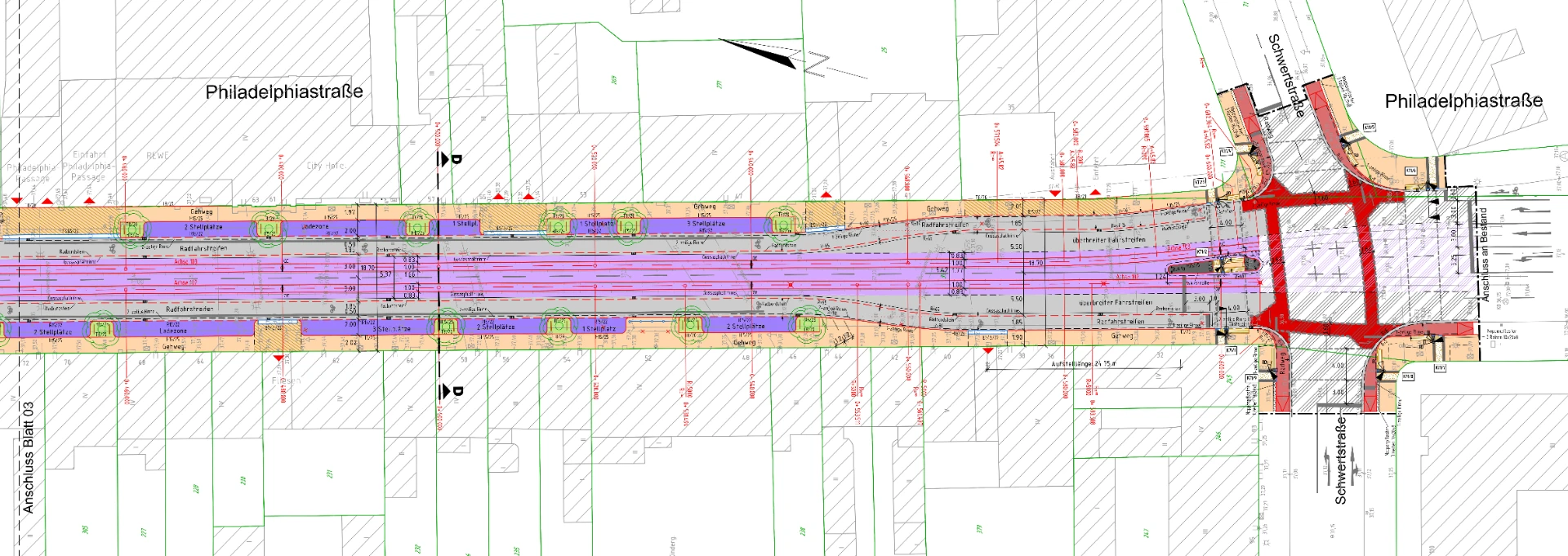 IPL CONSULT wurde mit der Objektplanung für Verkehrsanlagen (Gleis- und Straßenplanung) des etwa 850 m langen Straßenabschnitts beauftragt, der sich zwischen der Schwertstraße im Süden und dem Bleichpfad im Norden erstreckt. Der Straßenkorridor weist in diesem Bereich eine Breite von etwa 19 m auf. Im Rahmen der Planung lag der Schwerpunkt nicht nur auf der Schaffung ausreichend breiter und barrierefreier Gehweganlagen, sondern auch auf der Förderung des Radverkehrs. Daher wurden entlang der gesamten Strecke Radverkehrsanlagen eingerichtet. Dies stellte eine besondere Herausforderung hinsichtlich der Querschnittsaufteilung dar, da neben den Radverkehrsanlagen und dem motorisierten Individualverkehr auch eine Straßenbahnstrecke durch die Philadelphiastraße verläuft.